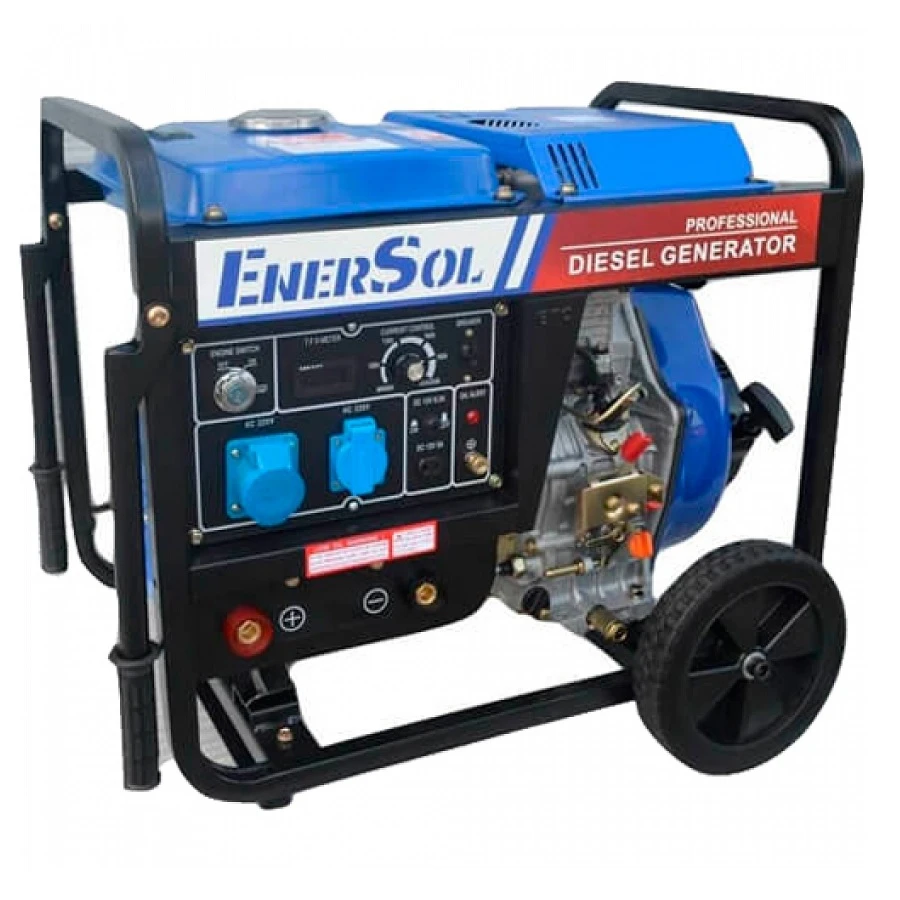 Дизельный генератор EnerSol SWD-7E имеет мощность 14 лошадиных сил и может использоваться для снабжения электричеством бытовых приборов, а также в качестве сварочного аппарата. Номинальная мощность производимого электрического тока составляет 6 кВт, в пиковой нагрузке инструмент способен показывать максимальный результат на уровне 6,6 кВт. Номинальное напряжение имеет значение 230 Вольт и предварительно стабилизируется перед подачей на электрические приборы. Генератор оснащен системой заземления, которая соединена с нейтральным проводом переменного напряжения на управляющей панели с помощью перемычки. Перед началом работ производитель рекомендует дать инструменту несколько минут на разогрев.