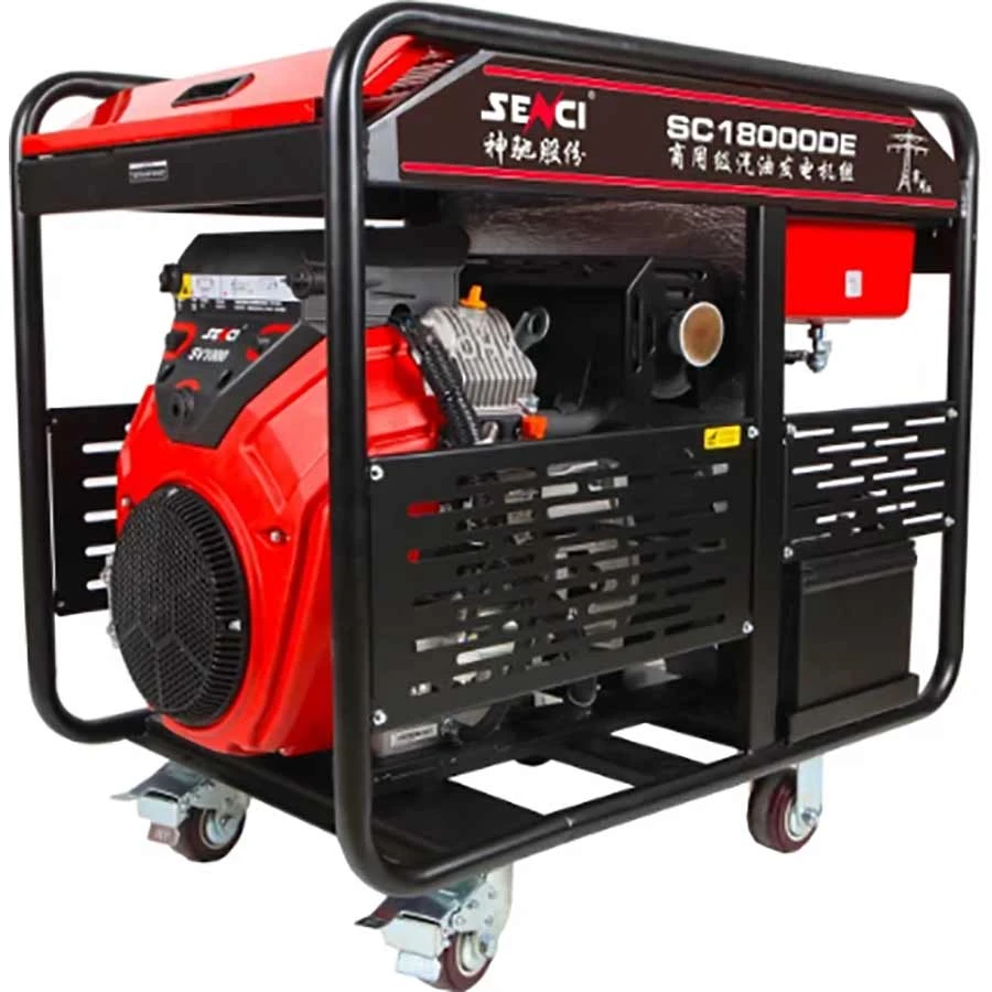 Senci SC18000DE - производительный бензиновый генератор с номинальной мощностью 15 кВт, при работе генерирует напряжение 220 В или 380, которое можно использовать для подключения электроинструментов или оборудования. На корпусе имеется 2 розетки на 220 В и 380 В. Встроенный бак на 42 л позволяет работать до 6 часов при нагрузке 100%. В данной модификации генератора установлен электростартер.