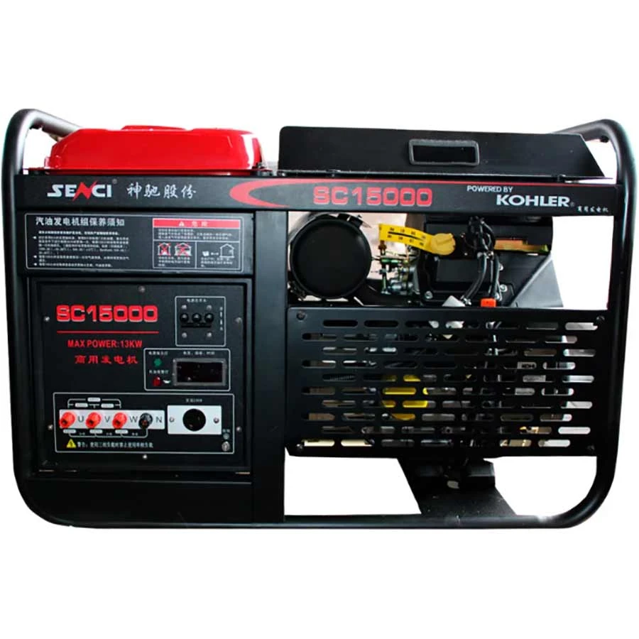 Senci SC15000-KH - продуктивний бензиновий генератор з номінальною потужністю 12 кВт, при роботі генерує напругу 380 В, яку можна використовувати для підключення електроінструментів або обладнання. На корпусі є клеми для підключення обладнання. Вбудований бак на 30 л дозволяє працювати до 4 годин при навантаженні 100%. У цій модифікації генератора встановлений електростартер.