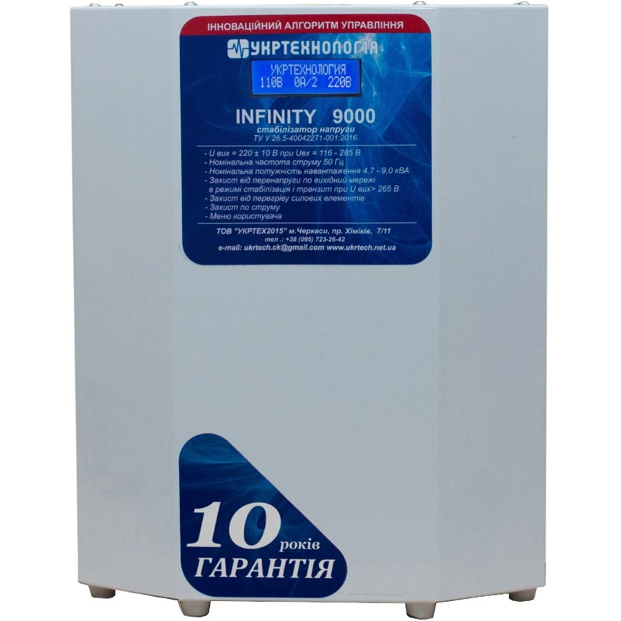 Симисторный стабилизатор напряжения УКРТЕХНОЛОГИЯ INFINITY 9000 на 9 кВт предназначен для применения практически со всеми типами потребителей на объектах, где входное напряжение изменяется в широком диапазоне от 108 В до 278 В.Купить стабилизаторы бытовые серии INFINITY с доставкой и монтажом можно в любом городе Украины, включая Одесса, Днепропетровск, Киев, Львов, Харьков и т.д.
